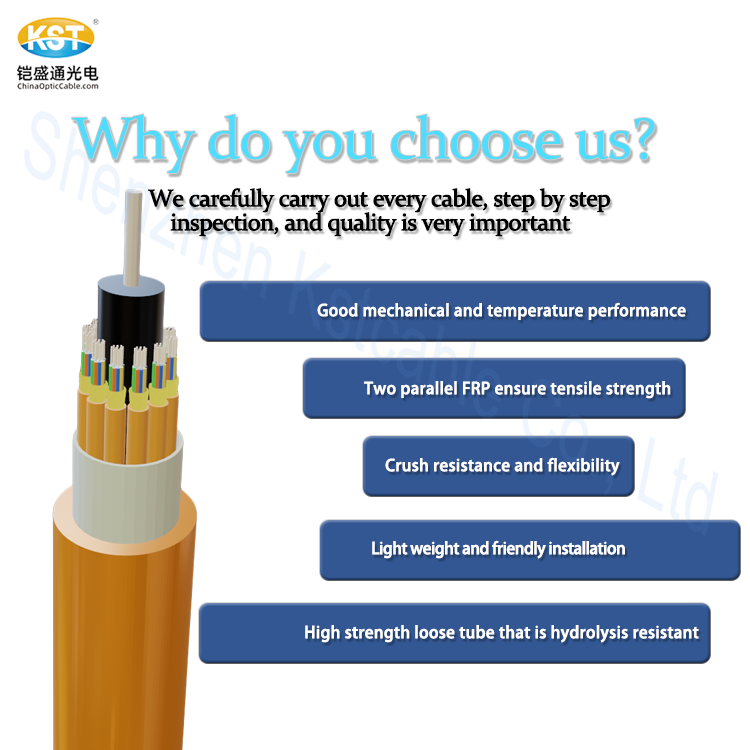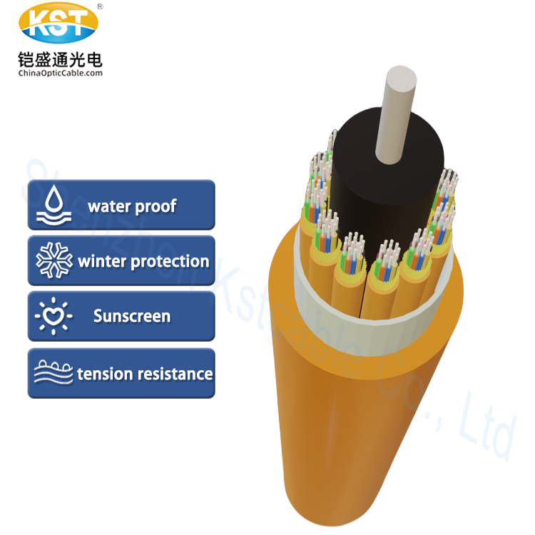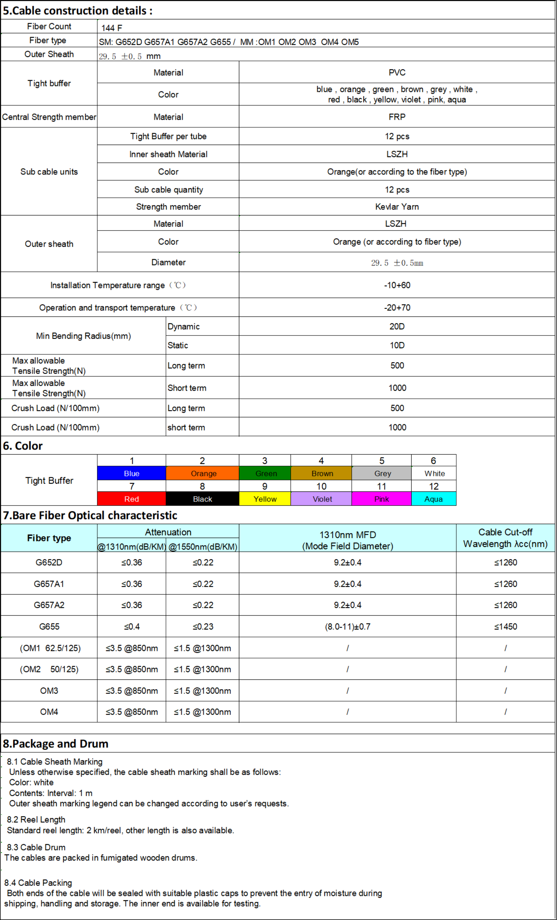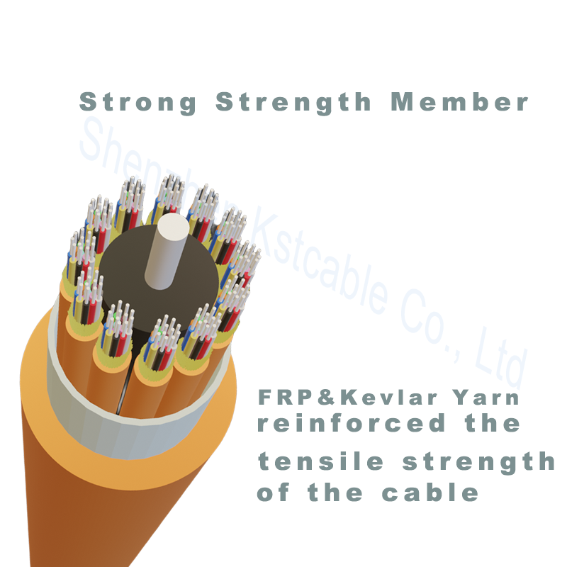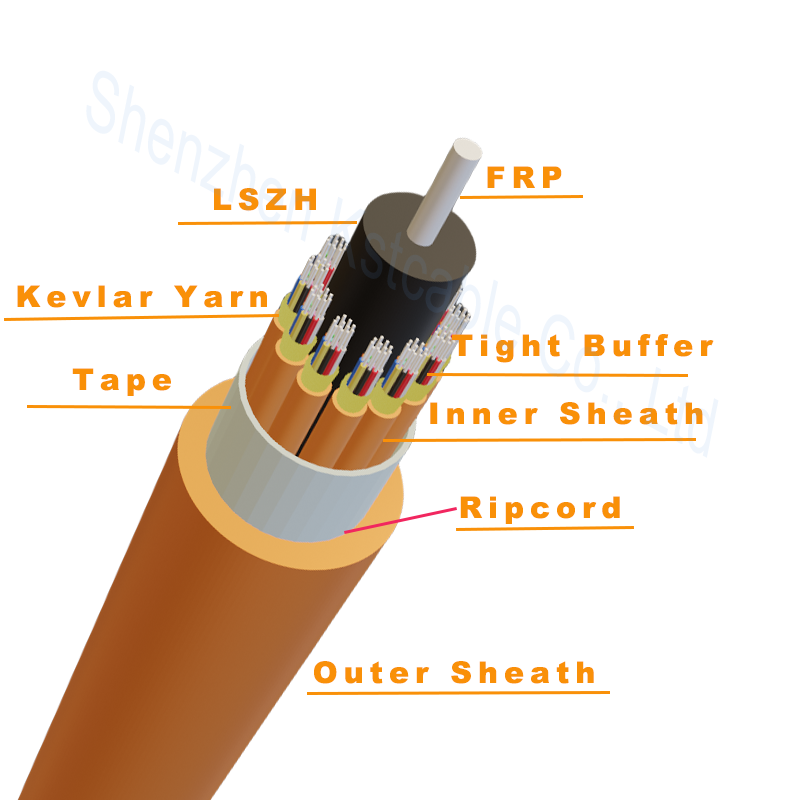 In the middle of the cable is a central FRP strength member wrapped with LSZH sleeve,surrounding the sleeve are 12 inner cable units, each inner cable unit is filled with Kevlar yarn and 12 tight buffers , The FRP and Kevlar yarn are functioned as strengthening tension force, if necessary, filler sticks are offten be used to instead of inner cable unit to make the cable structure more stable, To make the cable waterproof and compact effects, a layer of waterproof tape wrapping the 12 cable units together,The outermost part LSZH Outer Sheach integrates all above together to be a compact optical fiber cable .