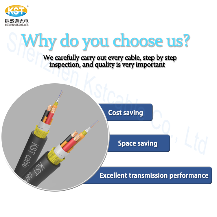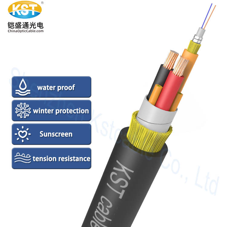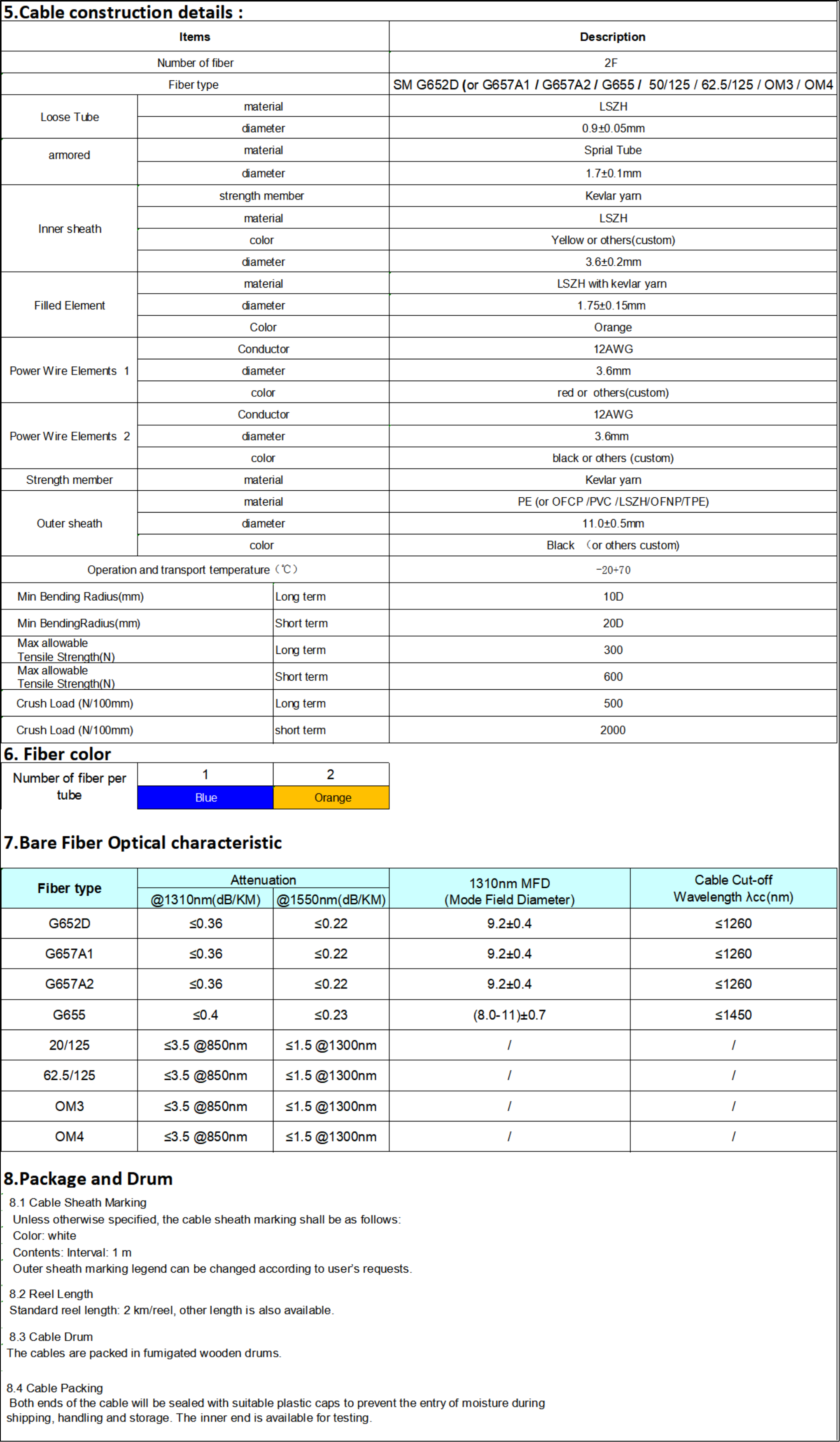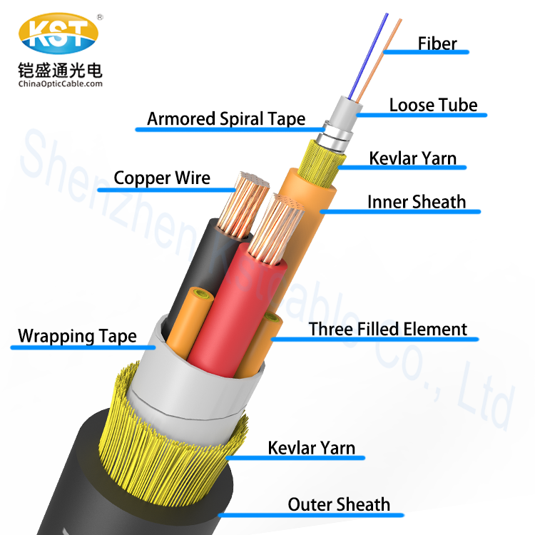 The overall structure of this cable consists of 3 functional units,3 Filled element units and outer 3 layers. The yellow functional unit with 2 fibers in the middle of it, and the fibers are filled in a protective LSZH loose buffer tube , A layer of rat-proof spiral armored steel tape wrapping outside of the LSZH tube, together with a layer of Kevlar yarn reinforce the tensile resistance of the cable, the outermost of the yellow unit is LSZH jacket ,the main function of the yellow unit is signal transmission ; The red and black functional units have the same structure of inner 12AWG copper wire and outer PVCP jacket, the main function of the copper wire is conductive and grounding ; To ensure the structural stability of the entire cable ,3 LSZH filled elements are placed inside the cable(Kevlar Yarn filled in it); For outer 3 layers, including inner wrapping tape,middle kelvar yarn and outermost TPE (or OFCP/PVC /LSZH/OFNP) outer sheath , together with all above contents,completed to be a integrated cable .