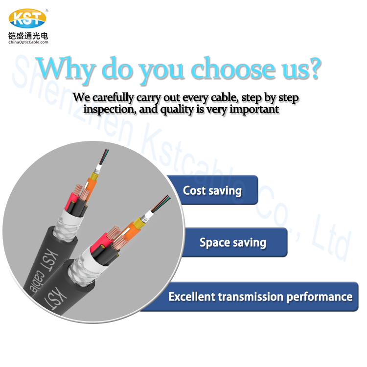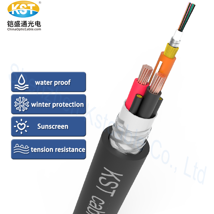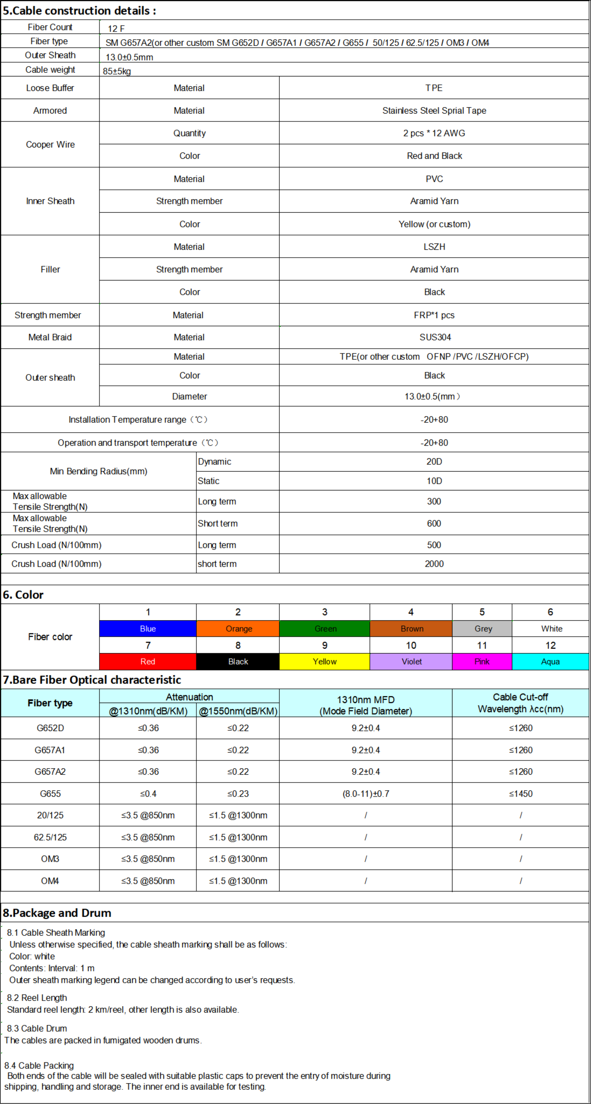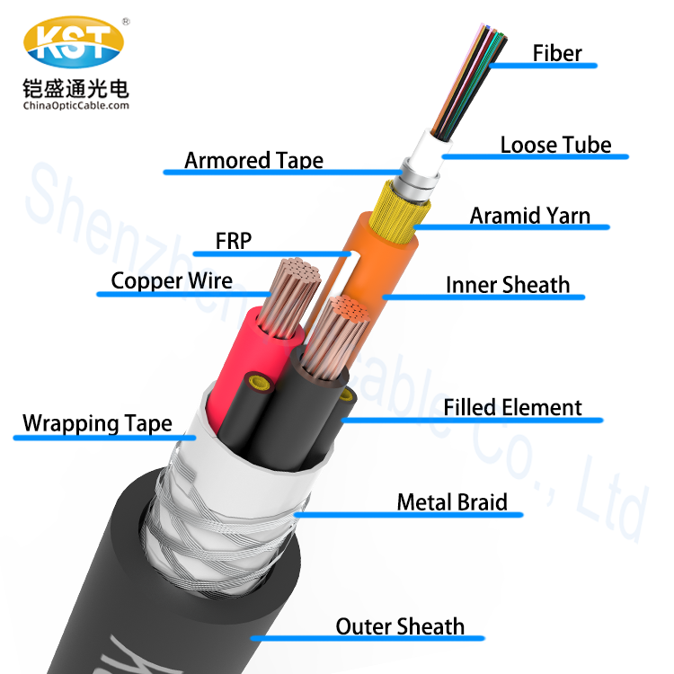 The overall structure of this cable consists of 3 functional units , 3 Filled element units and 3 outer layers, 1 FRP is in the middle of the Cable ; The yellow functional unit with 1pcs loose tube and 12 core Fiber fill in the middle of the tube, A layer of rat-proof spiral armored steel tape wrapping outside of it, together with a layer of Kevlar yarn reinforce the tensile resistance of the cable, the outermost of the yellow unit is LSZH jacket ,the main function of the yellow unit is signal transmission ; The red and black functional units have the same structure of inner 12AWG copper wire and outer PVC(or OFCP /LSZH/OFNP)jacket, the main function of the copper wire is conductive and grounding ; To ensure the structural stability and reinforce the tensile strength of the entire cable ,3 filled elements are placed inside the cable(Kevlar yarn+LSZH out sheath); For outer 3 layers, including inner wrapping tape,middle Metal braid and TPE(or OFCP/PVC /LSZH/OFNP) outer sheath , together with all above contents,completed to be a integrated cable
