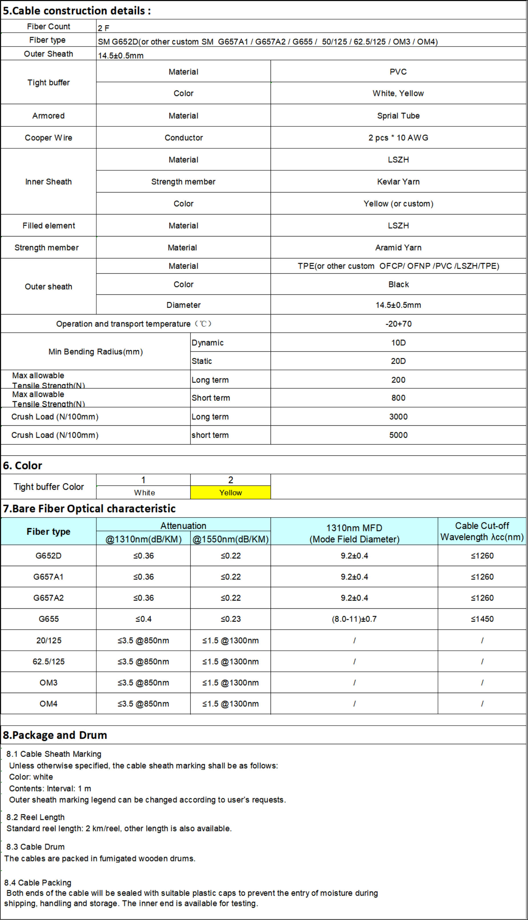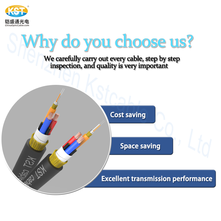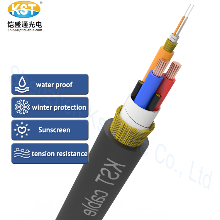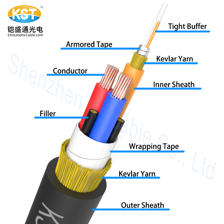 The overall structure of this cable consists of 3 functional units , 3 Filled element units and 3 outer layers , The yellow functional unit with 2 tight buffers(buffer color can be customized) , A layer of rat-proof spiral armored steel tape wrapping outside of tight buffer, together with a layer of Kevlar yarn reinforce the tensile resistance of the cable, the outermost of the yellow unit is LSZH jacket ,the main function of the yellow unit is signal transmission ; The red and black functional units have the same structure of inner 10AWG copper wire and outer PVC jacket, the main function of the copper wire is conductive and grounding ; To ensure the structural stability and reinforce the tensile strength of the entire cable ,2 filled elements(Kevlar yarn+LSZH out sheath) are placed inside the cable; For outer 3 layers, including inner wrapping tape,middle kelvar yarn and outermost TPE(or /OFCP/PVC /LSZH/OFNP) outer sheath , together with all above contents,completed to be a integrated cable .