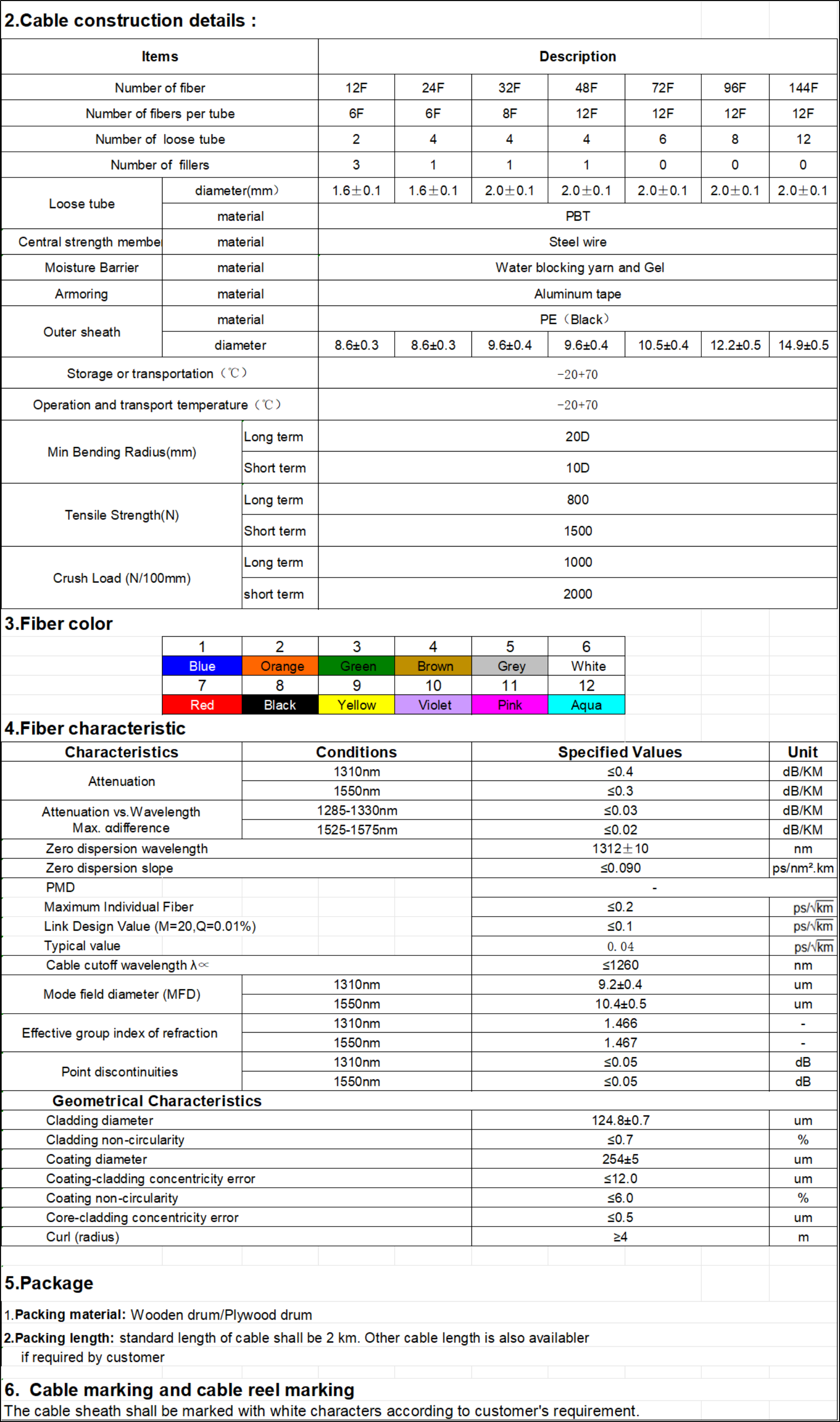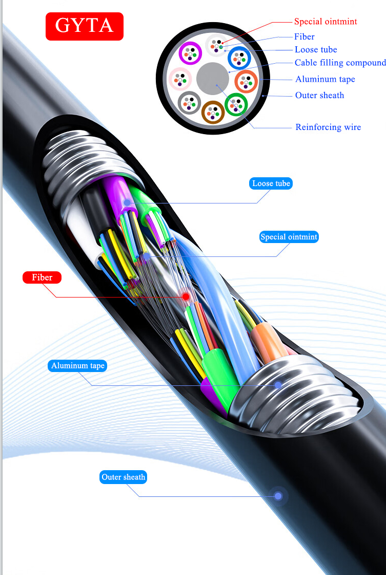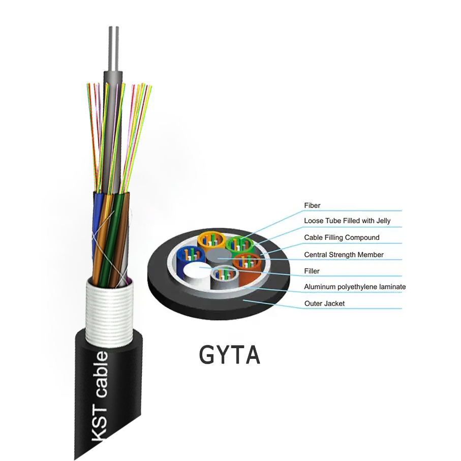 GYTA is an outdoor communication optical fiber cable,Structure with a central steel wire strength members provide enough tensile strength; filler protected tubes offer protection for the fibers;The cable is Aluminum tape armored and covered by PE outer sheath, resulting in anti-UV , resistant to high and low temperature cycles,anti-aging,moistureproof.Suitable for aerial, pipeline laying,Long distance and local area network communication.