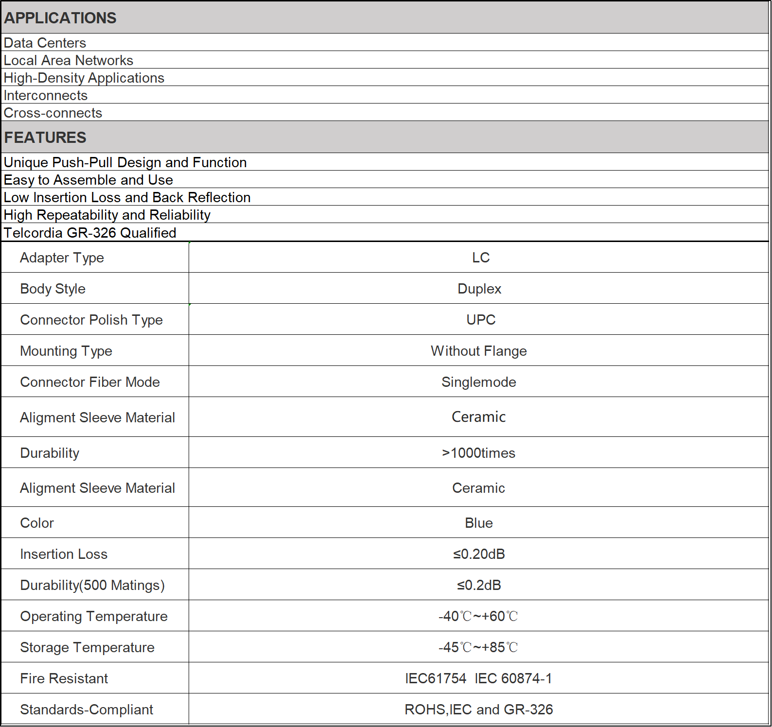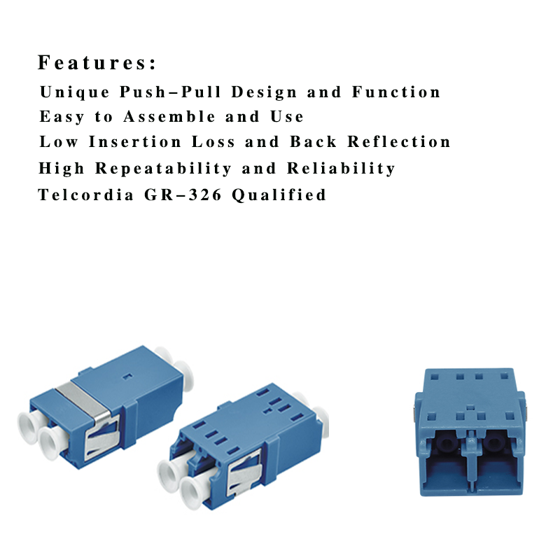 Fiber optic adapter, also called coupler, is a small device designed to terminate or link the fiber optic cables or fiber optic connectors between two fiber optic lines. By linking two connectors precisely, fiber optic adapters allow the light sources to be transmitted at most and lower the loss as much as possible. At the same time, fiber optic adapters have the merits of low insertion loss, good interchangeability and reproducibility. And each fiber optic Adapter is functionally tested before shipping.