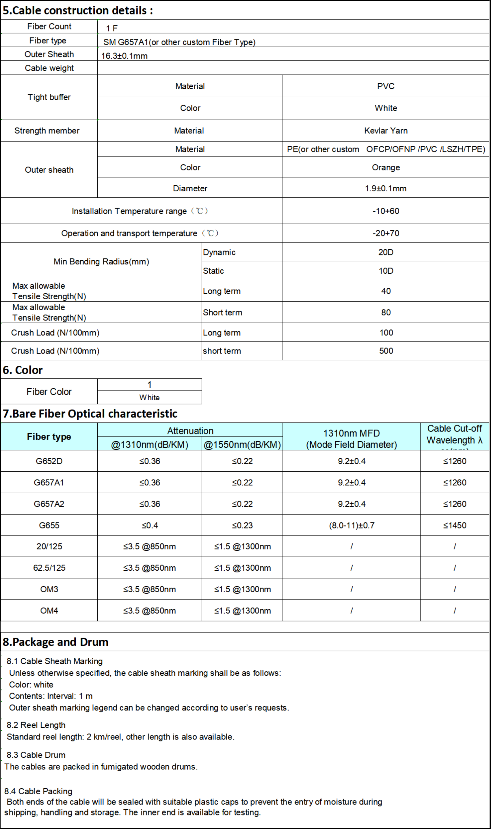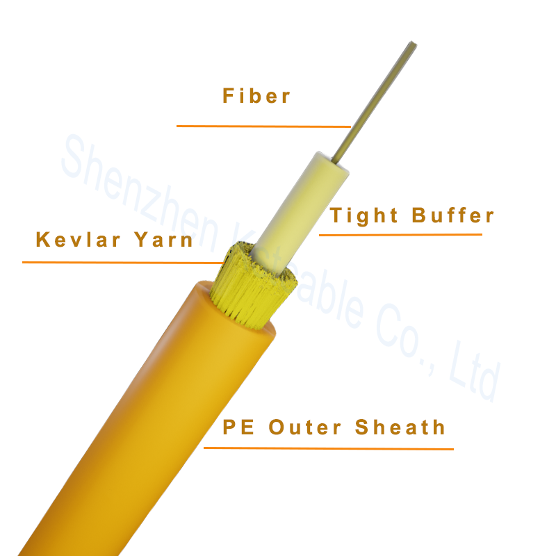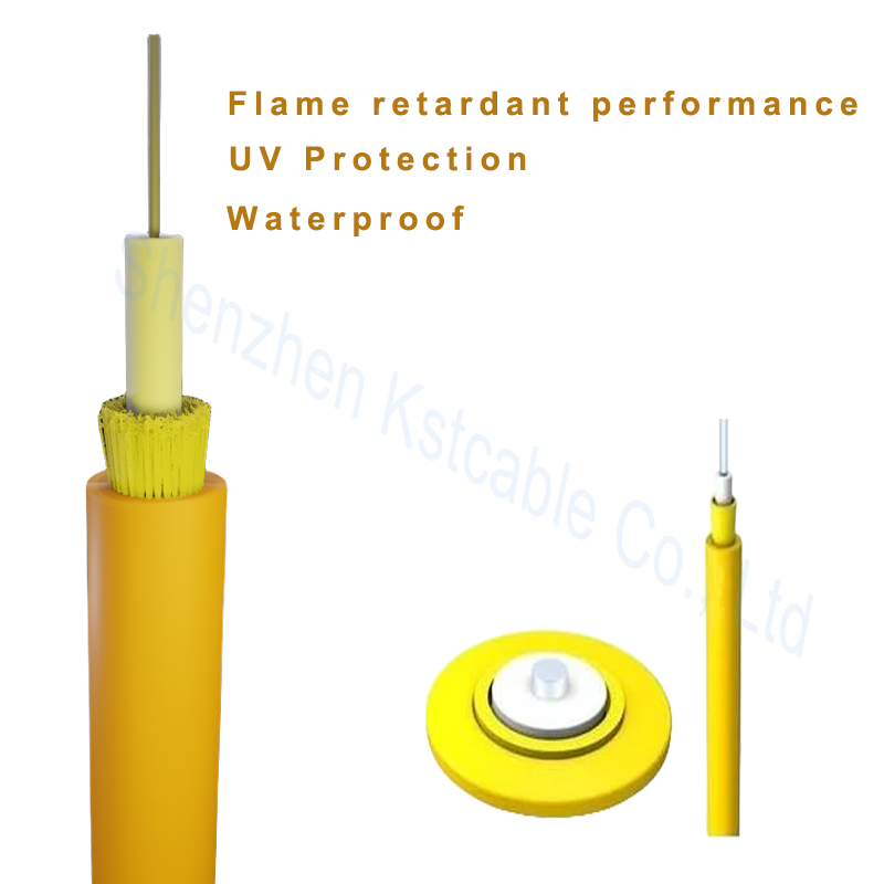 Single tight buffer optical fiber for easy stripping ,Compact sleeve optical fiber has good flame retardant performance ,Aramid strength member reinforce the tensile strength of the cable, External corrosion resistance protection PE outer sheath , waterproof, UV protection, flame retardant, environmental protection and other advantages