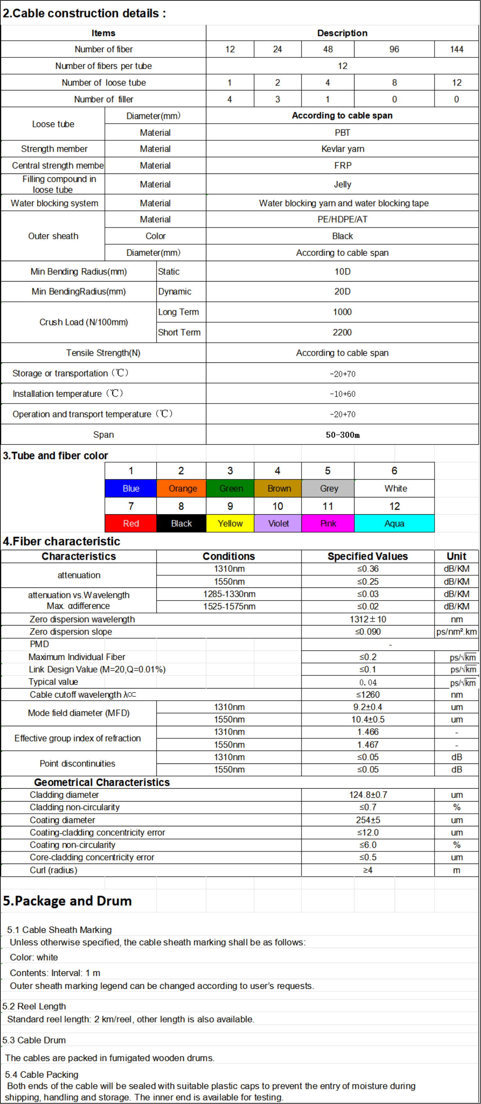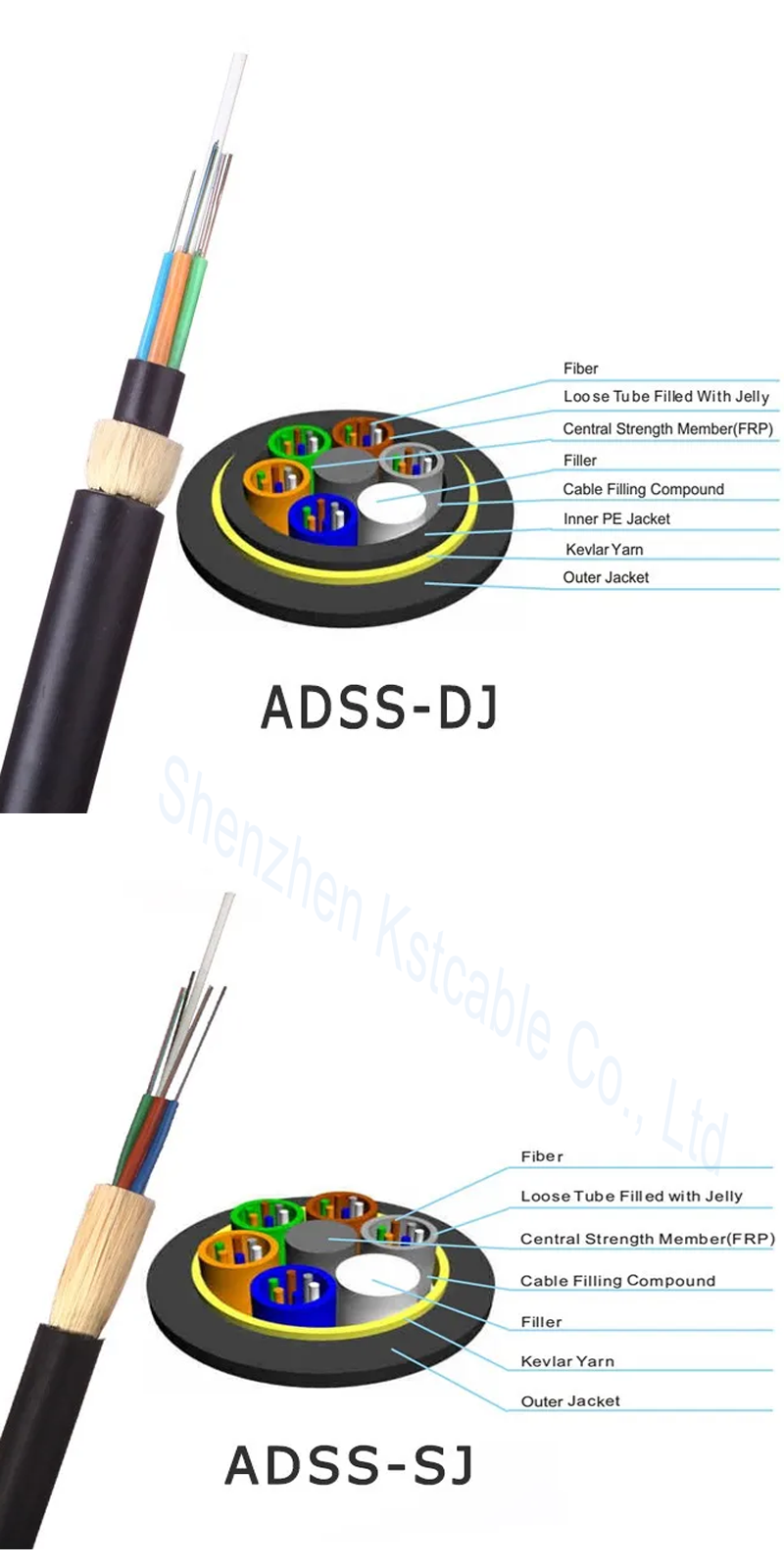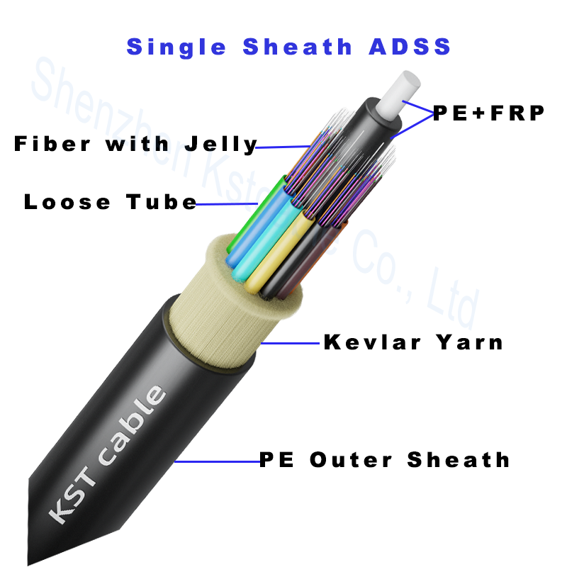 ADSS,Single sheath All-Dielectric Self-Supporting cable, it's fibers are positioned in loose tubes made of high modulus plastics,filling with water-resistant filling compound,the tubes and fillers are stranded around ,a non-metallic central strength member FRP,then into a compact and circular cable core. After the cable core is filled with filling compound, the cable is completed with PE or AT (anti-tracking) outer sheath.The cable can be installed without shutting off power,Largest span is over 100m.